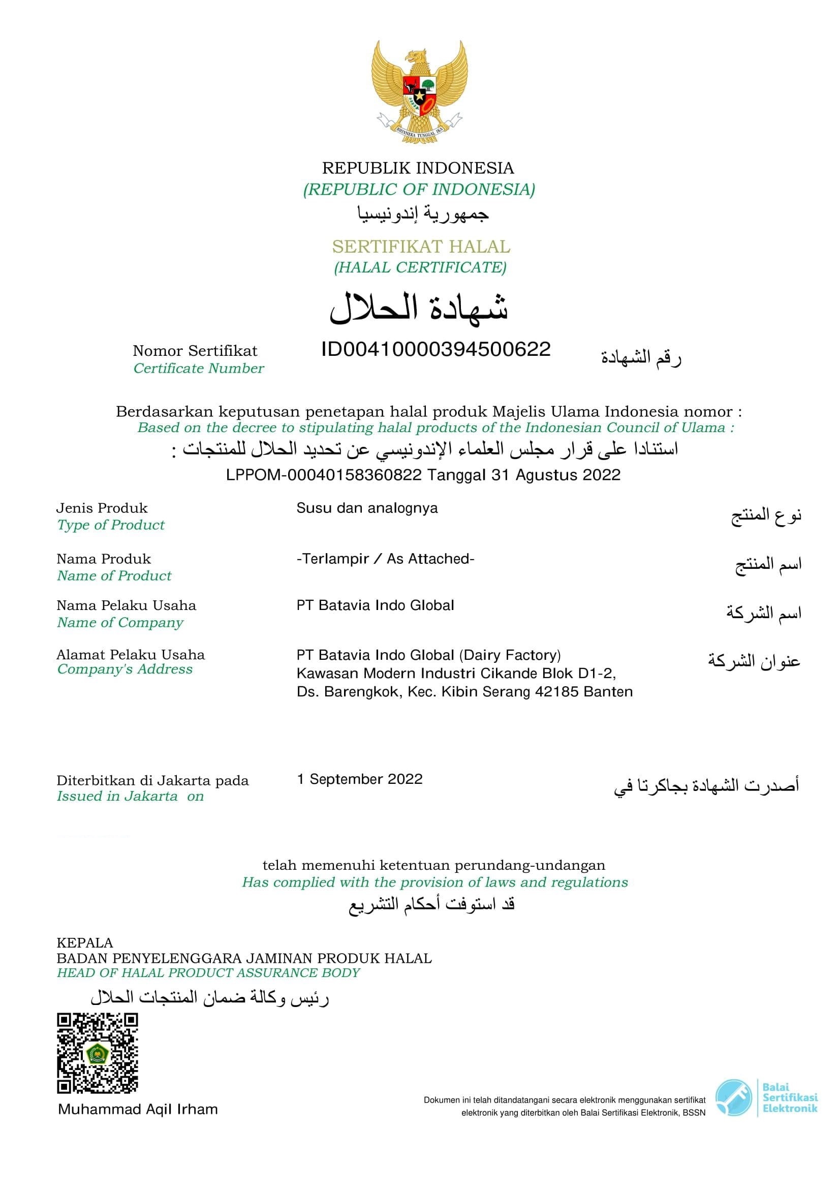 The Halal Product Assurance Organizing Body (BPJPH) under the auspices of Ministry of Religious Affairs of the Republic of Indonesia. BPJPH was formed on October 2017 based on the mandate of Law Number 33 of 2014 concerning Halal Products Assurance.