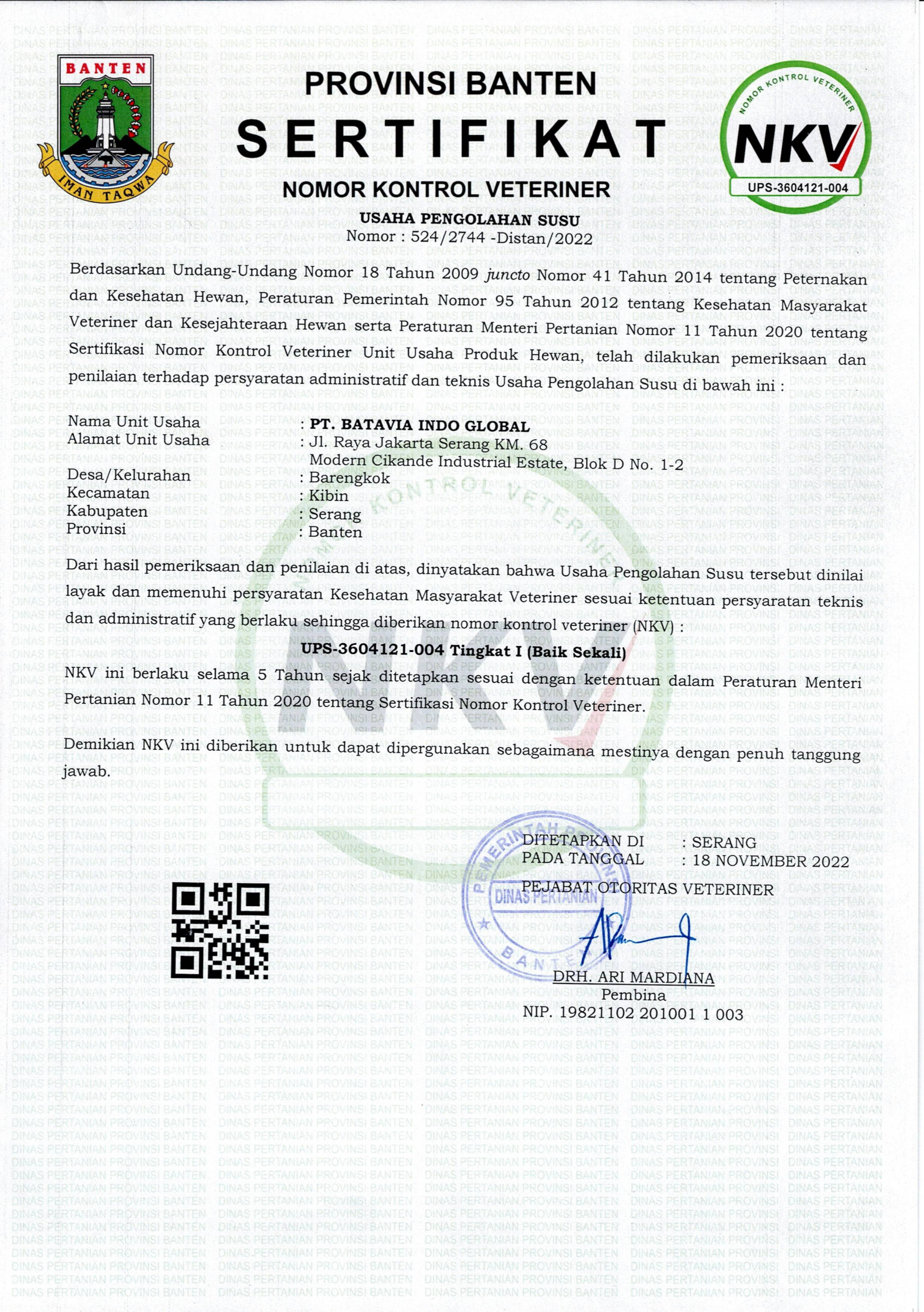 Veterinary Control Certificate of Animal Origin Business Unit, hereaafter referred to as Veterinary Control Number (NKV) , means a certificate as a val-id written proof that hygiene and sanitary requirements have been fulfilled as the basic feasibility of guaranteeing the safety of food of animal origin in an animal origin food business unit.