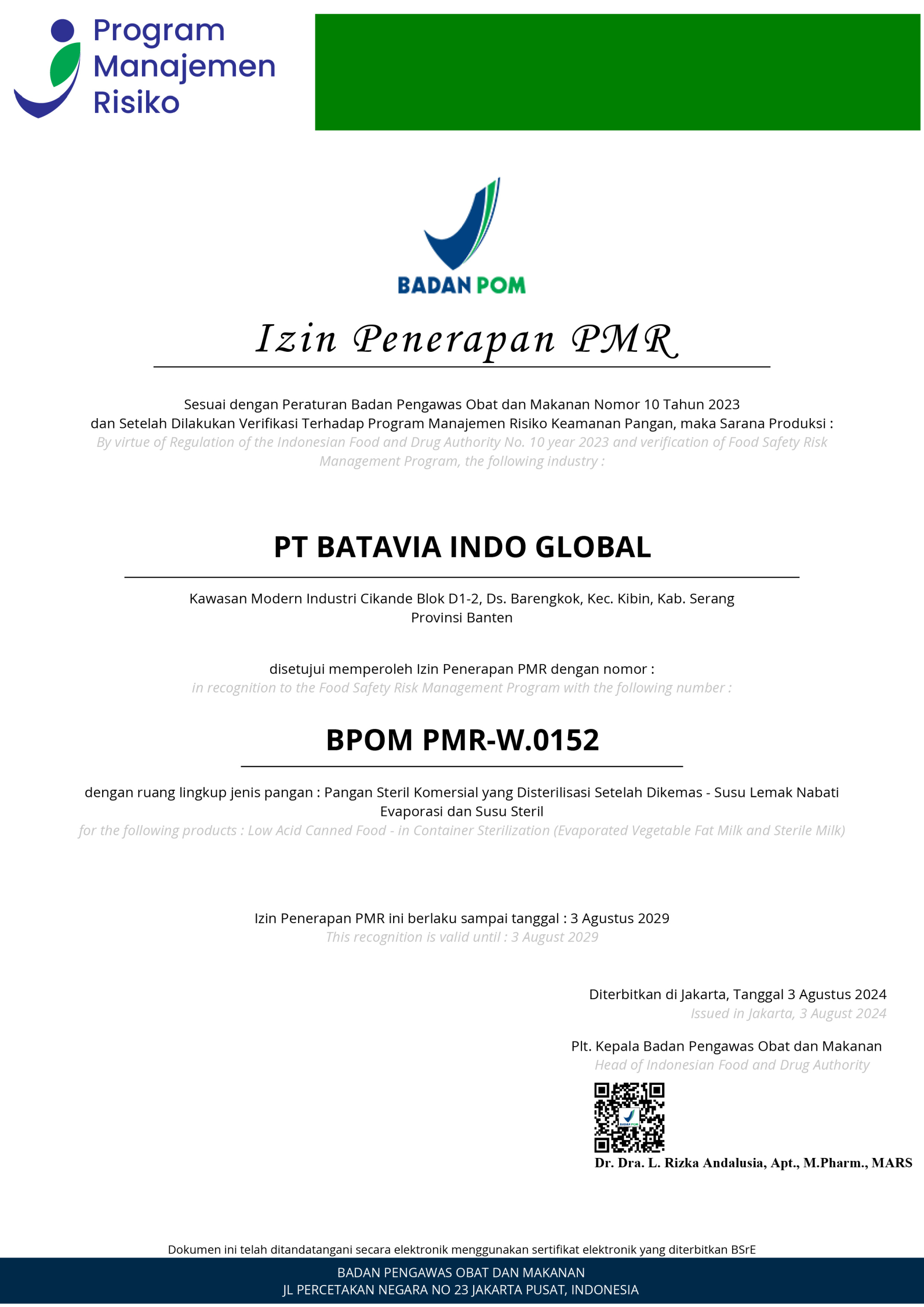 The National Agency of Drug and Food Control (Badan Pengawas Obat dan Makanan – “BPOM”) has enforced the Food-Safety Risk-Management Program (Program Manajemen Resiko – “PMR”) at Processed Food Production Facilities in order to update various provisions on the food safety PMR due to the urgent need for a comprehensive legal framework and to bring the PMR into line with recent Scientific and Technological developments.